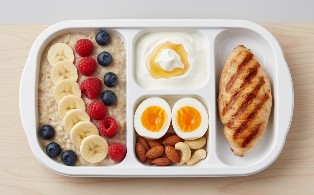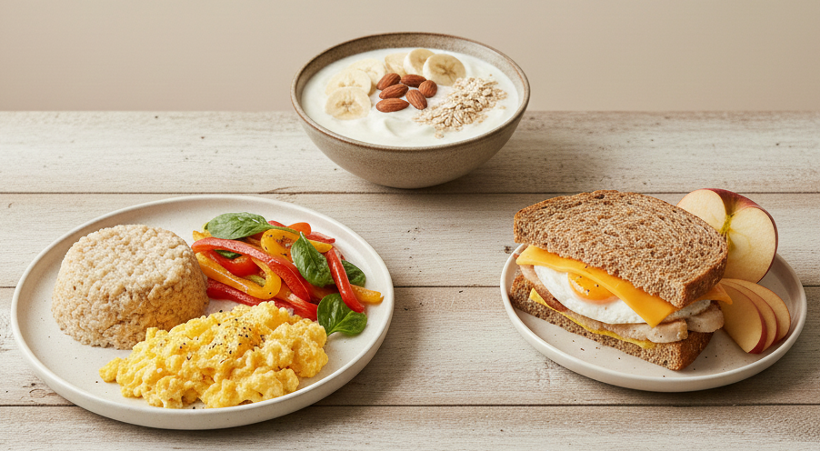 계란 2개, 그릭요거트 150g, 두부 반모, 닭가슴살 소량. 단백질은 포만감을 오래 유지하여 오전 에너지 저하를 막아줍니다.